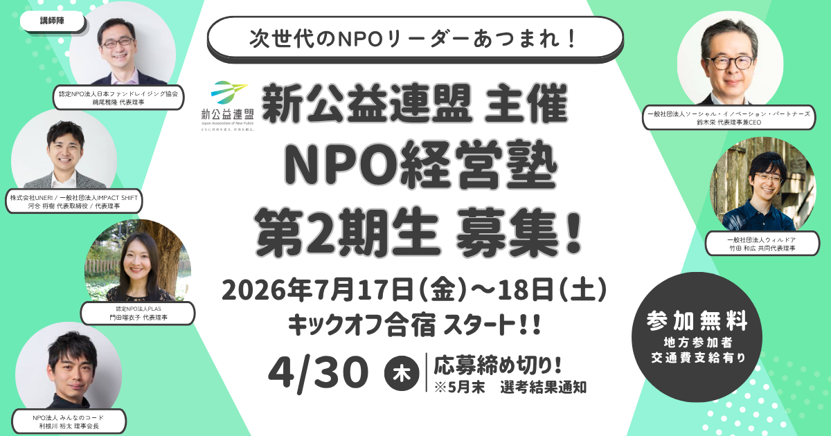 次世代のNPOリーダーが、持続可能かつ社会的インパクトの大きい組織へ成長していける手助けとなるために、2025年度に引き続き、新公益連盟による担い手育成プロジェクトとして『NPO経営塾』を開講します。